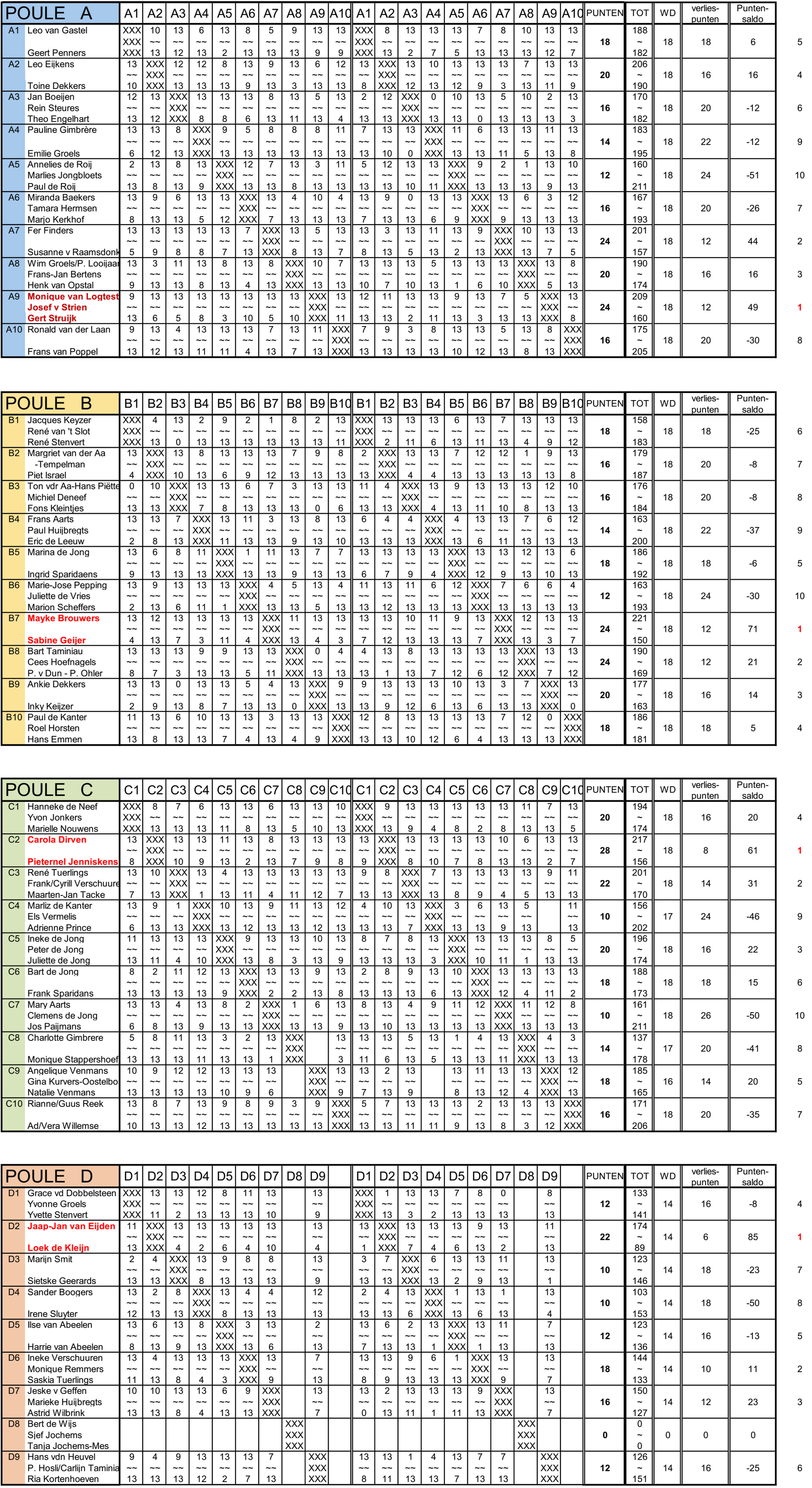 (Om een zo recent mogelijke tussenstand te kunnen laten zien, hierbij het vriendelijke doch dringende verzoek de uitslagen zsm na het spelen van de wedstrijden door te geven!!)